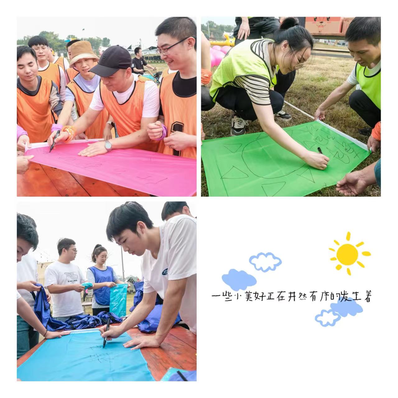 在欢乐有爱的氛围下,共生百人团对队被分成了6组小团队,在这里,没有公司领导,没有员工,只有并肩作战的队友。推选组长、取队名、定队呼、队歌、绘队旗、设计团队造型,“火药味”十足的趣味运动会就此拉开帷幕。