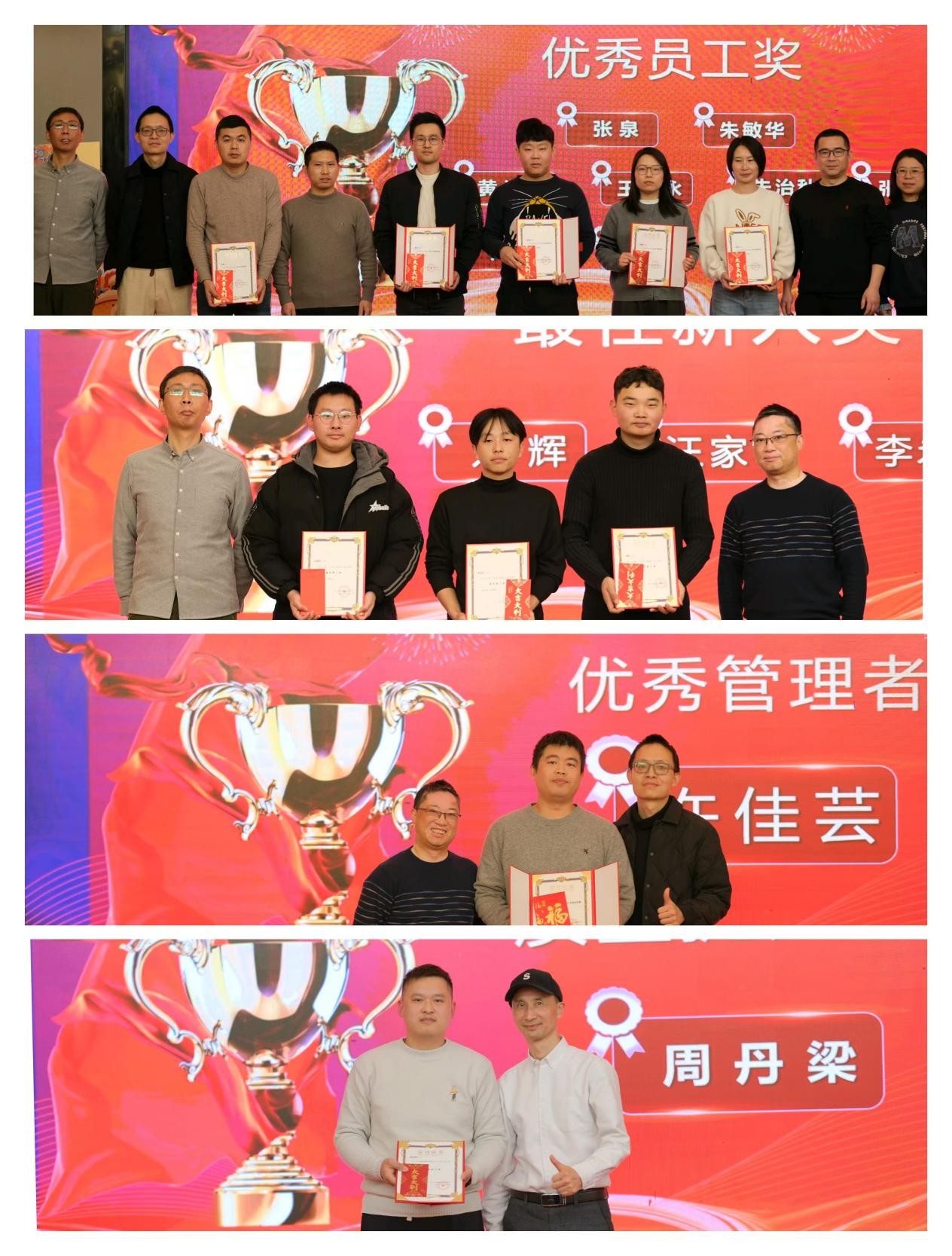 表彰环节也是每年年会的又一亮点。公司秉持公平、公正、公开的原则,依据员工在业绩表现、工作能力、团队协作、创新精神等多方面的综合考量,颁发了多个重要奖项。设计开发部主管许佳芸凭借在产品研发优化方面的卓越表现和出色的团队领导能力,荣获 “优秀管理者” 称号。这一奖项不仅是对她个人工作的高度认可,更是激励其他管理者不断提升管理水平,带领团队创造更大价值。10 位 “优秀员工” 在各自的岗位上默默耕耘、成绩斐然,他们是公司的中流砥柱,用实际行动诠释了敬业精神和专业素养。3 位 “最佳新人奖” 获得者,虽然入职时间不长,但凭借积极进取的态度和快速的学习能力,迅速融入公司并取得了优异成绩,展现出了无限的潜力。5 位 “客户好评奖” 得主,始终以客户为中心,用优质的服务赢得了客户的高度赞誉,为公司树立了良好的品牌形象。2 位 “独具慧眼奖” 获得者,凭借敏锐的洞察力和严谨的工作态度,及时发现并解决了产品质量问题,有效避免了潜在风险,为公司产品质量保驾护航。此外,公司还颁发了 5 周年贡献奖、10 周年贡献奖以及特殊贡献奖,包括学习之星奖、最佳服务奖等。这些奖项旨在表彰那些长期坚守岗位、为公司发展做出突出贡献的员工,他们的奉献精神和专业能力成为了全体员工学习的榜样。
